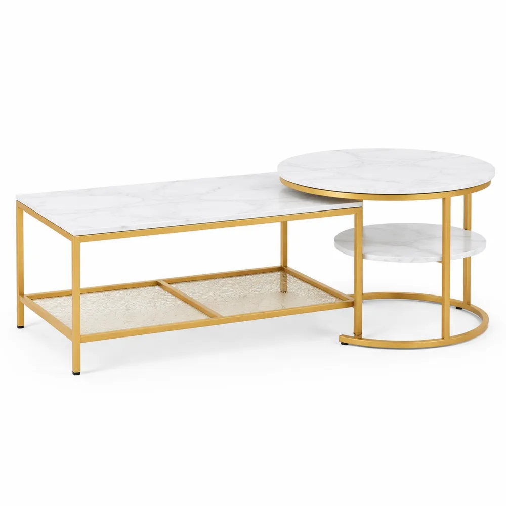 Set di Tavolini da Salotto Moderni Rotondi con Effetto Marmo, a 2 Ripiani in Metallo Oro
