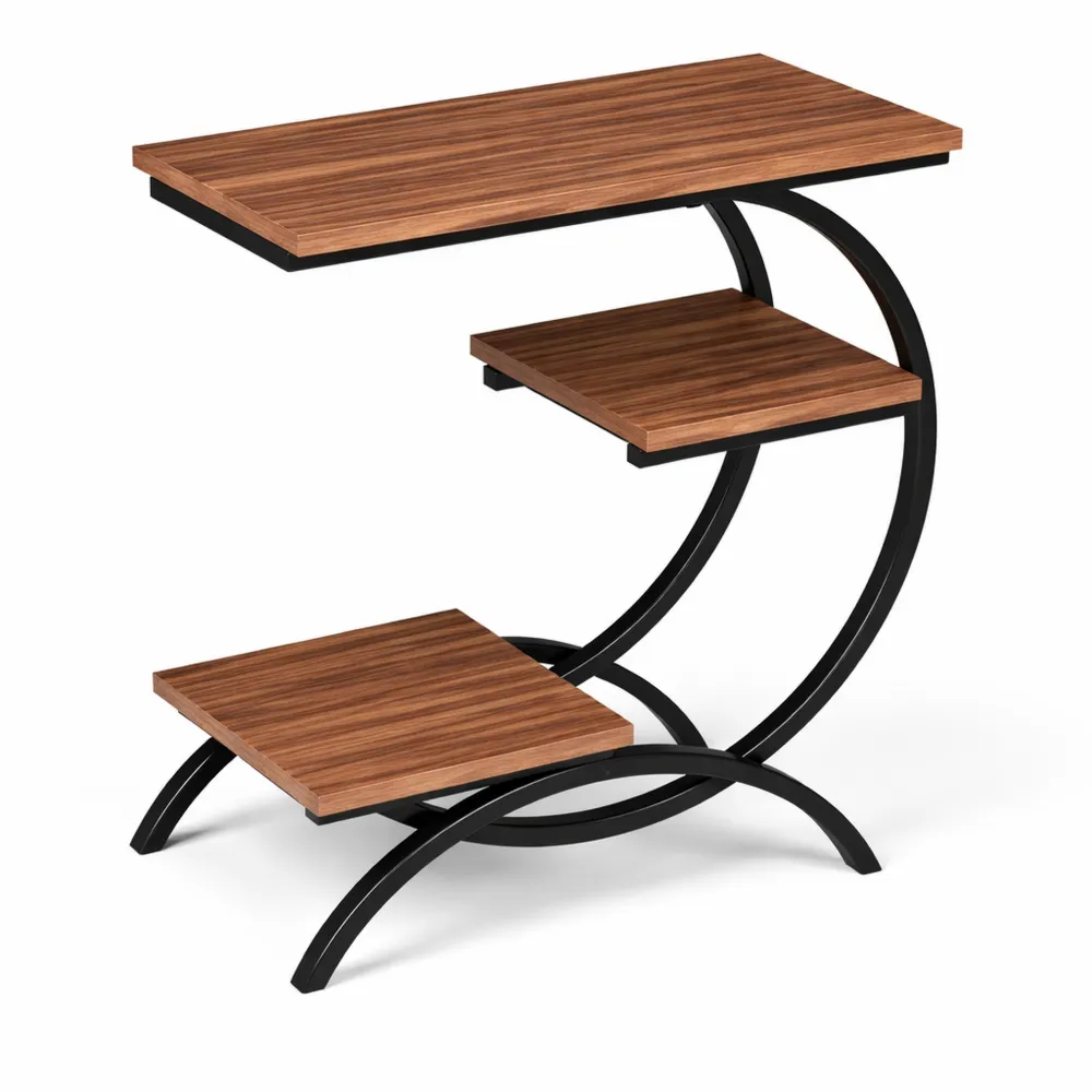 Questo tavolino in legno presenta un design a forma di C ed è dotato di tre ripiani. Può essere collocato accanto al divano o in camera da letto per riporre libri, riviste e telecomandi. La struttura in metallo nero assicura stabilità.